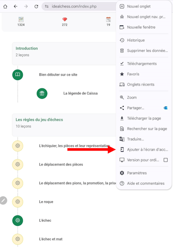 2 - Cliquer sur les 3 petits points à droite de la barre en haut du navigateur pour faire apparaître le menu. Dans le menu, cliquer sur Ajouter à l'écran d'accueil.